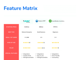 Katana pricing is friendlier on the wallet starting at just $99/mo for the Essentials Plan. However there are some drawbacks such as you can only have 1 user. That could be a deal breaker for a larger organization that would have 3-5 users of its inventory management software.